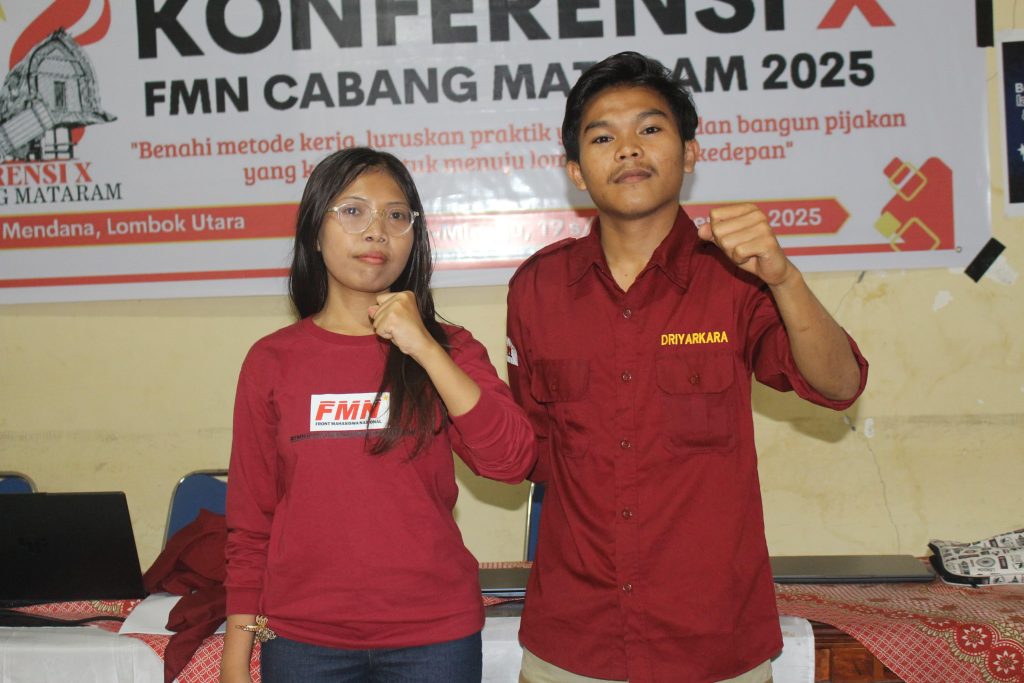 Mengusung tema “Benahi Metode Kerja, Luruskan Praktik yang Keliru, dan Bangun Pijakan yang Kokoh untuk Menuju Lompatan Jauh ke Depan”, Konferensi Cabang FMN Mataram menegaskan pentingnya pembenahan internal organisasi sebagai prasyarat untuk memperkuat arah perjuangan di tengah situasi nasional yang ditandai oleh menguatnya pembungkaman demokrasi di era pemerintahan Fasis Prabowo-Gibran Dalam forum tersebut, FMN Cabang Mataram secara tegas menyoroti maraknya kriminalisasi terhadap aktivis, mahasiswa, dan rakyat yang menyuarakan kritik, dan komersialisasi pendidikan yang kian mahal dan menutup akses rakyat miskin terhadap pendidikan tinggi.