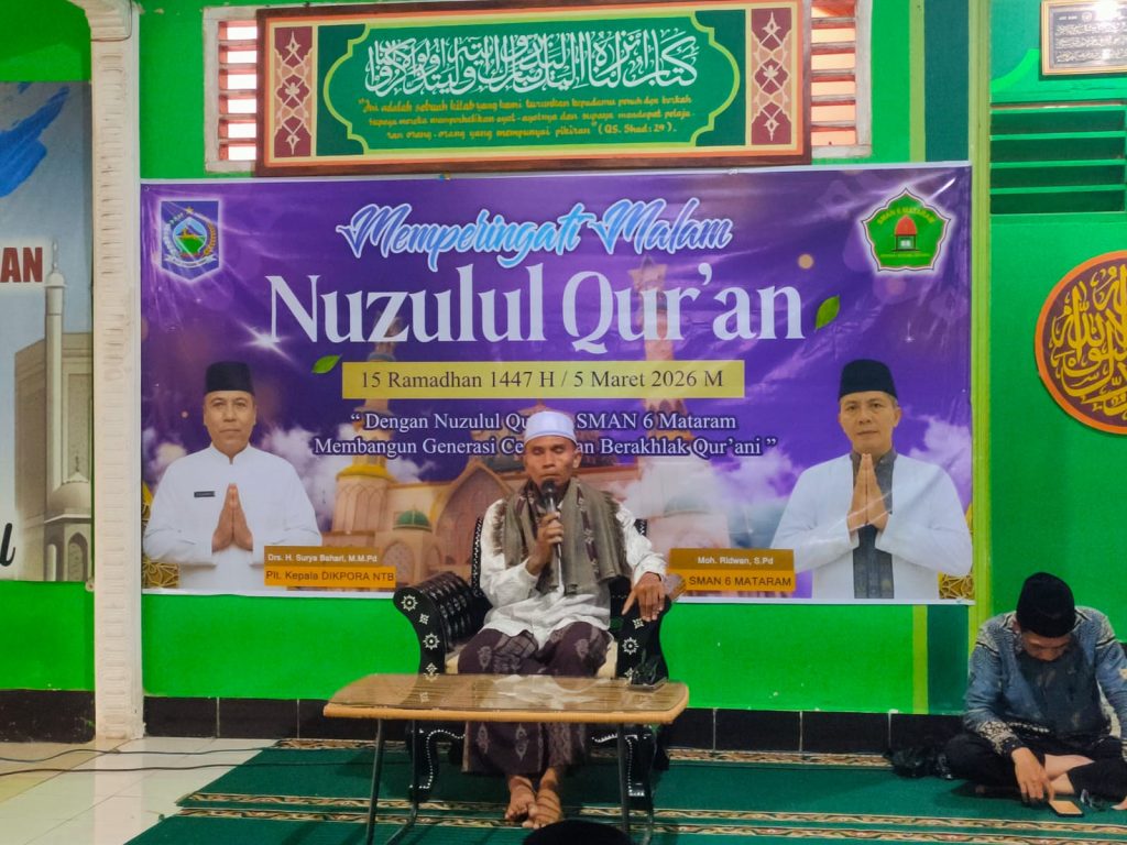 Mataram, Fokus NTB – SMA Negeri 6 Mataram menggelar kegiatan peringatan Nuzulul Qur’an pada Kamis (5/3/2026) dengan mengusung tema “Dengan Nuzulul Qur’an SMAN Negeri 6 Mataram Membangun Generasi Cerdas dan Berakhlak Qur’ani”. Kegiatan yang berlangsung khidmat ini dilaksanakan di Mushola SMA Negeri 6 Mataram dan diikuti oleh seluruh warga sekolah.